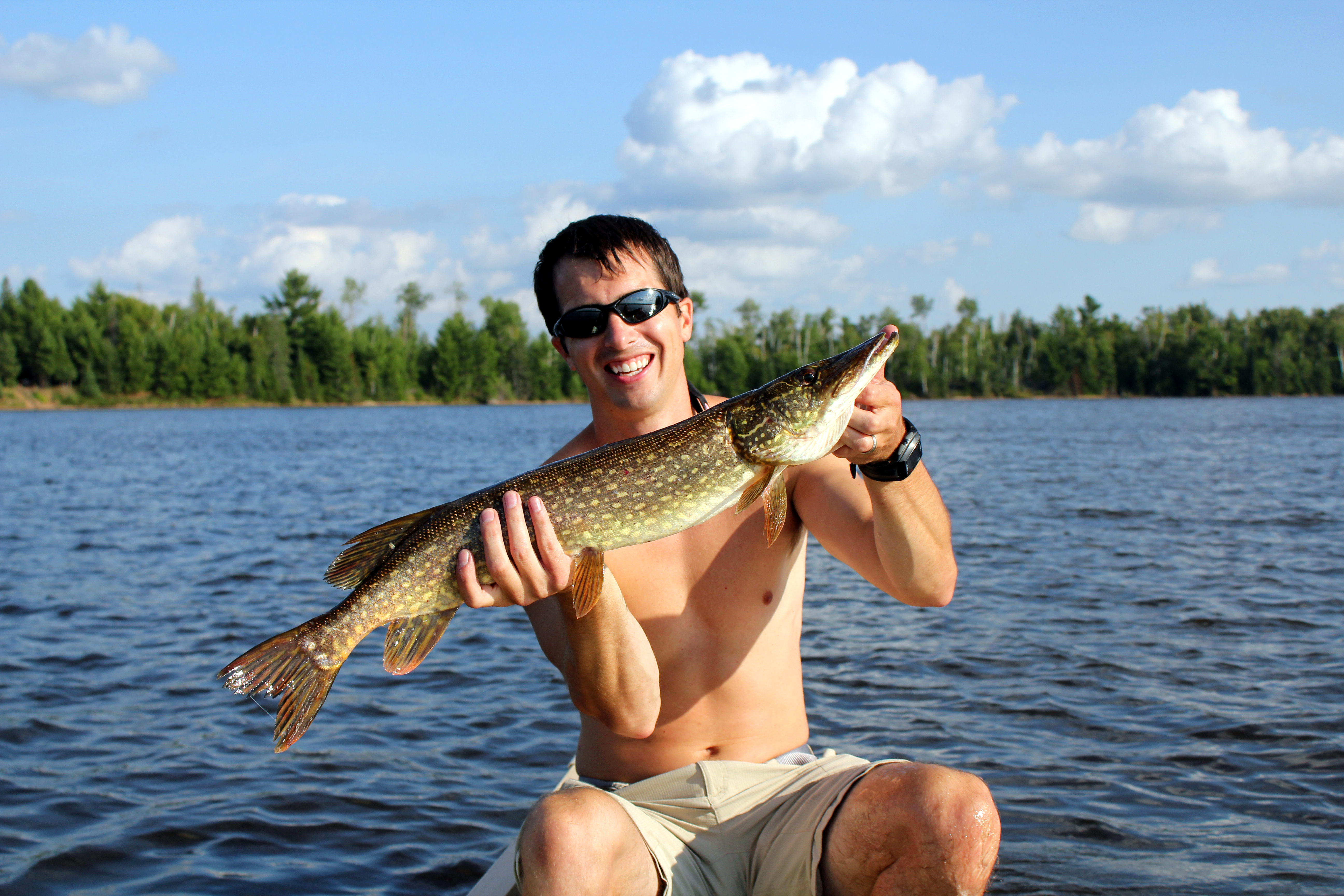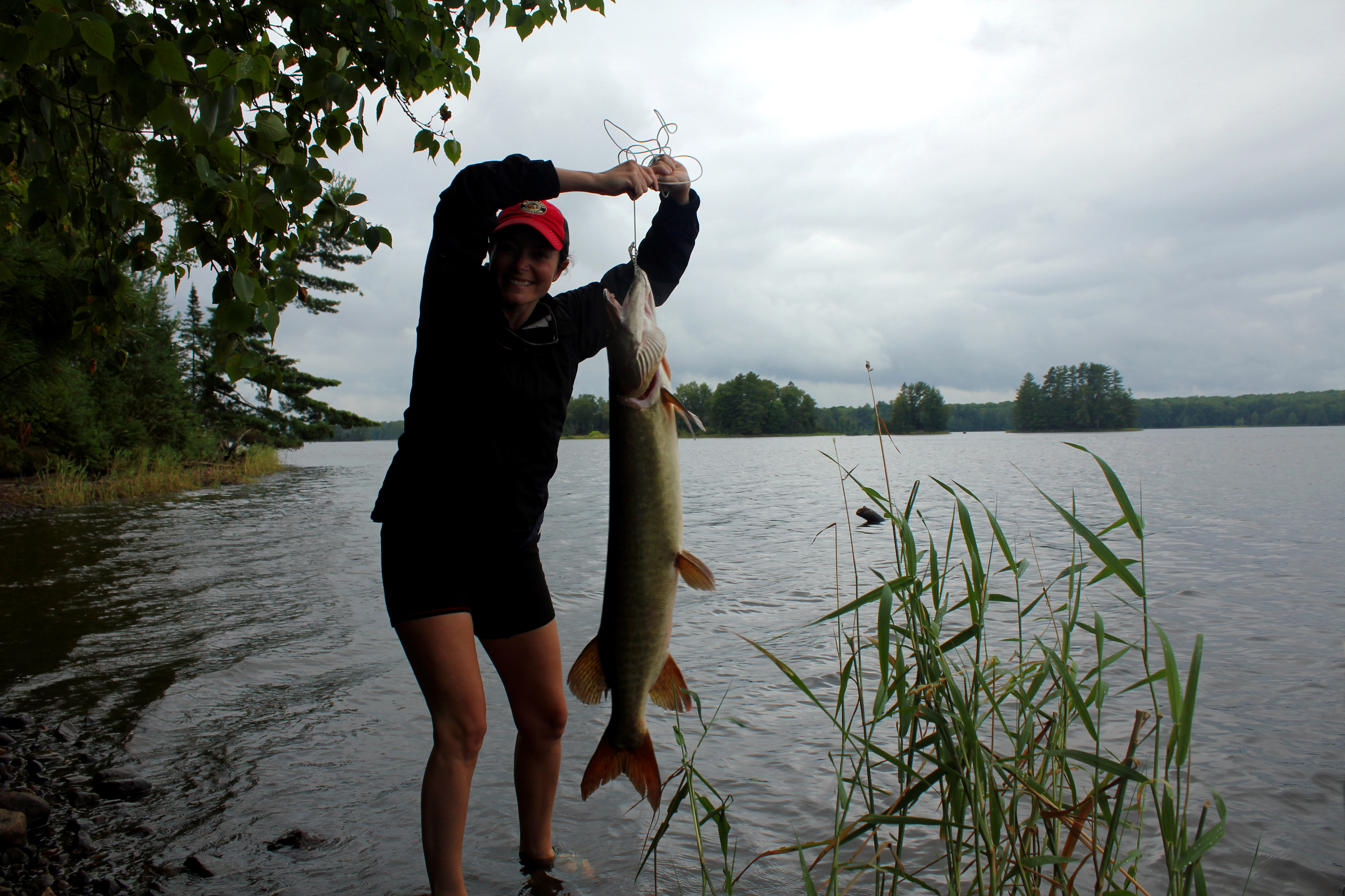 We had not gotten too far when I noticed a log sticking up in the middle of the lake and decided to check it out. Seeing some weeds near it, I figured it was a mid-lake hump, and a great spot to look for some bass or walleye. I told Molly to cast out to the right of the stump, and before I could even get my lure in the water, Molly’s reel started screaming as line poured off it at an alarming rate. She fought the monster at the end of her line like a champ and only once offered me the rod; I thought about it for a split second, and then remembered that someone would have to net this behemoth without tipping the canoe! The fish surfaced again and again to look at us, then would tear downward into the abyss taking volumes of line with it. After the longest battle on rod and reel that I have ever witnessed, Molly finally got it close enough to the boat to get it into the landing net. This fish was no joke! It bent the net badly as I hauled it out of the water, but Molly had just caught her first musky… a 44 inch musky no less!
