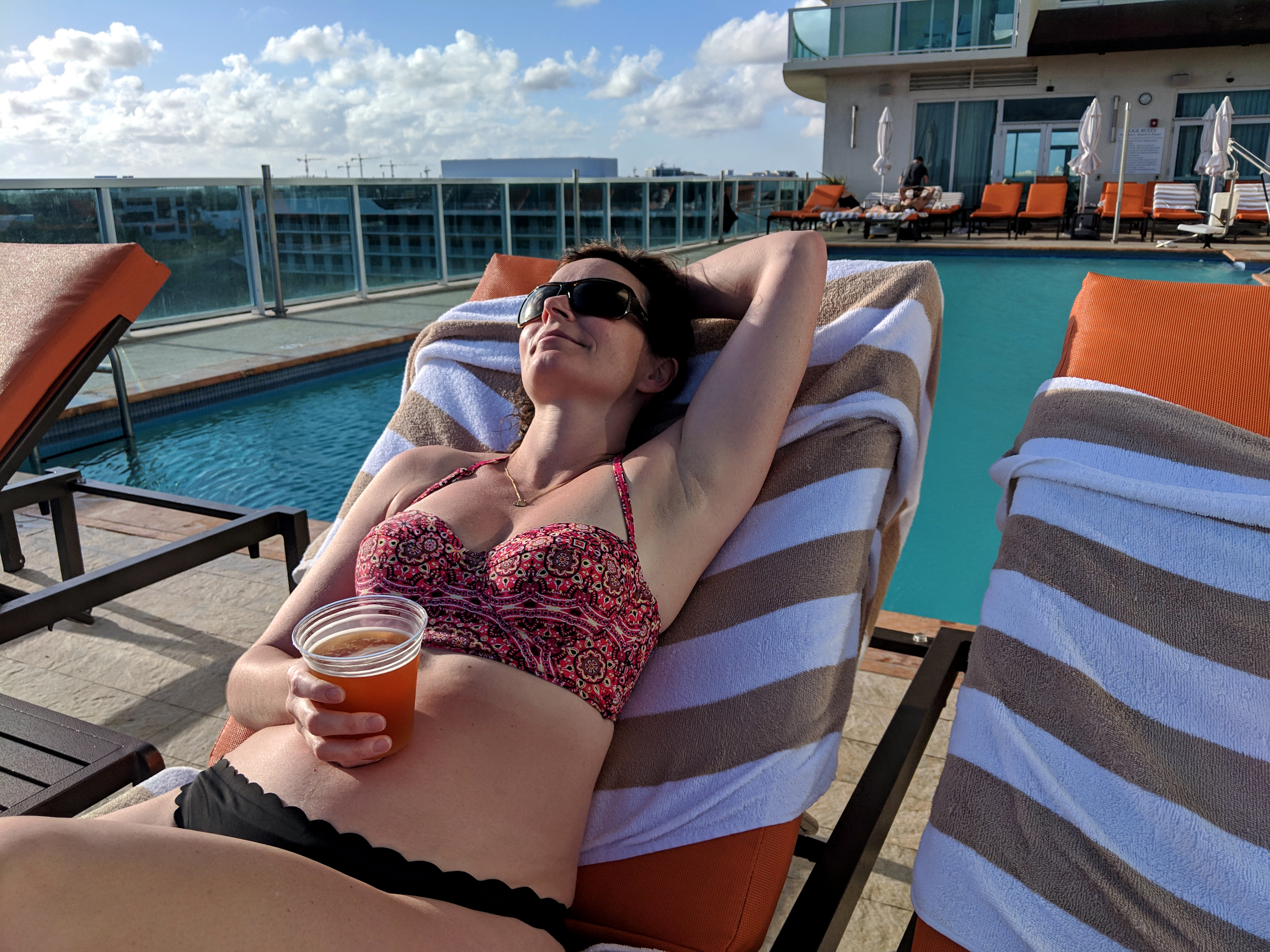 Since I wasn’t due for wedding rehearsal activities until Friday evening, the next morning we decided to soak up the sun at the Confidant’s beach and pools. Both were well appointed and we quickly accomplished what all good Midwesterners do when we travel south in the winter: get a sunburn! Pink faces notwithstanding, we got our fill of vitamin D and by early afternoon headed to Coral Gables to check into the Hyatt Coral Gables and prepare for the the wedding rehearsal and dinner.